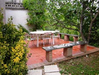 Tisch und Stühlen ausgestattet. Die Seite ist mit ein Blick auf einen großen Obstgarten. Das Schwimmbad ist nur 500 Meter weit, in der Wohnung Paradiso.